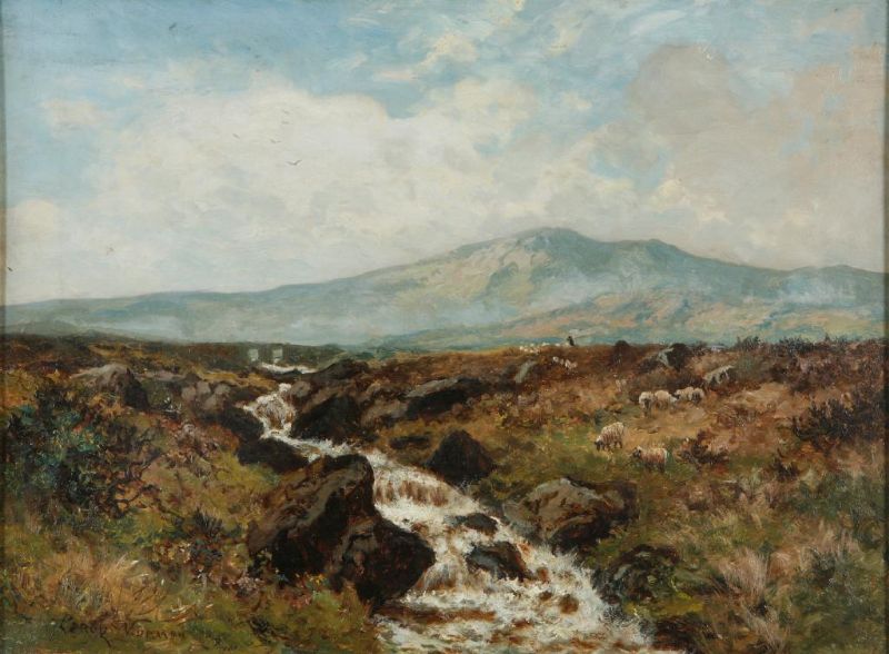A MOORLAND RIVER LANDSCAPE with sheep grazing