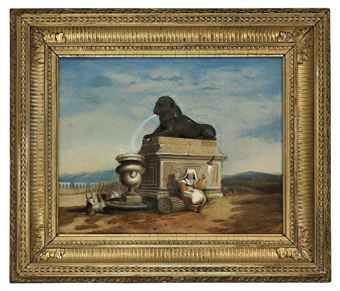 | A statue of a lion in the Roman Campagna landscape with a woman spinning | |