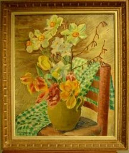 Narcisser och tulpanbukett i spansk stol