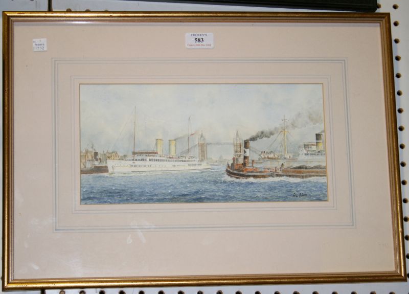 The |Queen of the Channel| with Tower Bridge astern and a Tug towing a Coal Barge