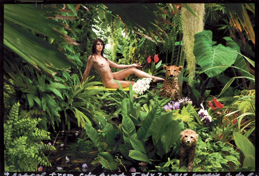 | Charlotte Gainsbourg posant nue dans un décor de jungle avec deux félins | |
