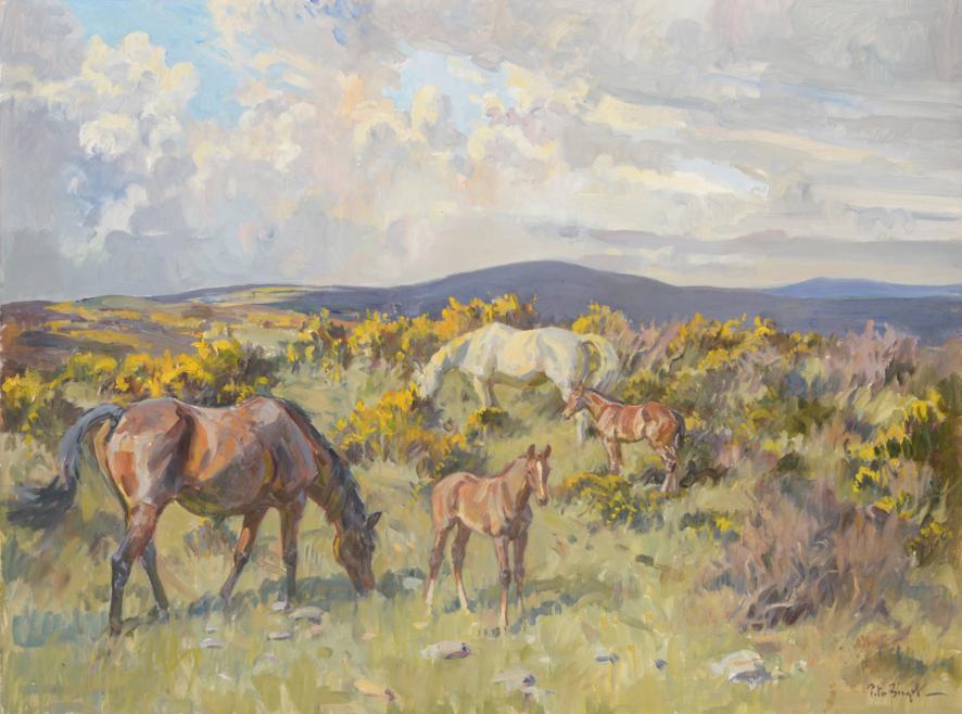 Horses and foals grazing on moorland