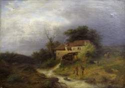 | Sommerliche Landschaft mit an einem Bachlauf stehender Mühle. Vorne am Ufer sich unterhaltende Wanderer. | |
