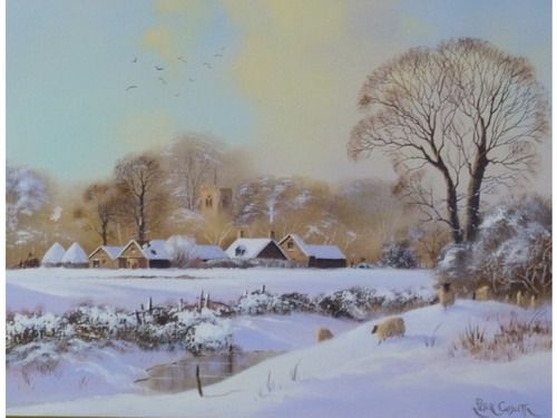 | Winter landscape with sheep in snow in foreground, village and church in background | |