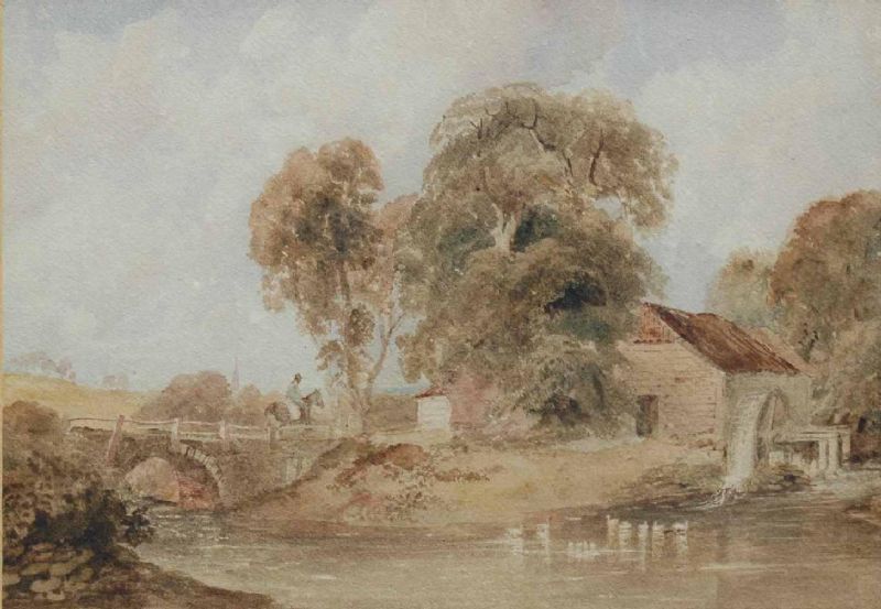 A horseman crossing a bridge by a water mill