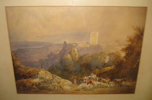 Panoramic view with cattle and sheep to the fore, ruins in the background