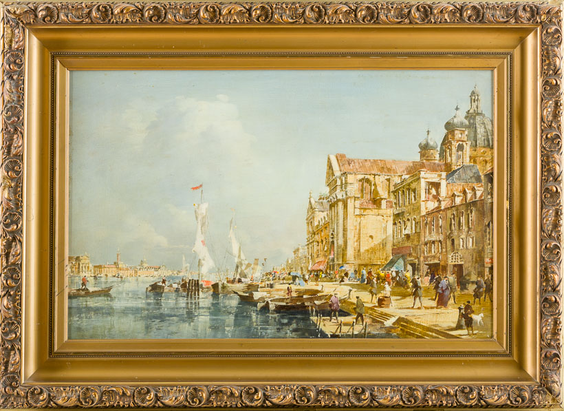 Venedig. Gesuatikirche mit der Vaporettohaltestelle Zattere, Passanten und ankernden Booten