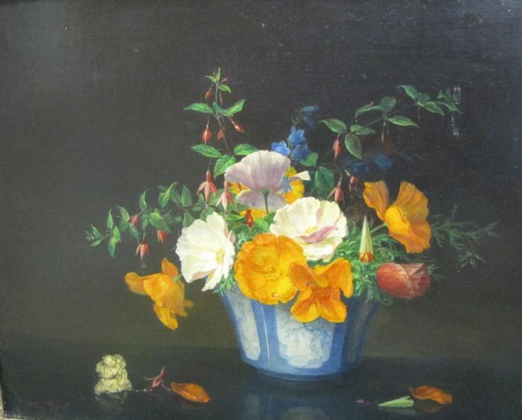 A Still Life of mixed Flowers in a Bowl on a Ledge