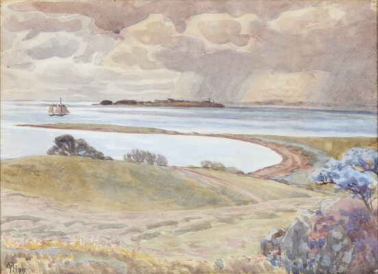 Coastal scenery with a sailing ship.