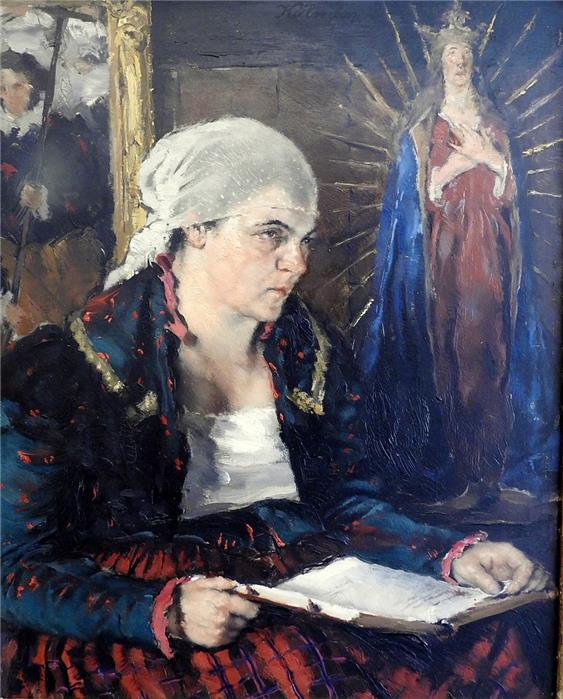 Portrait einer betenden Frau in Tracht, mit einem Buch auf dem Schoß
