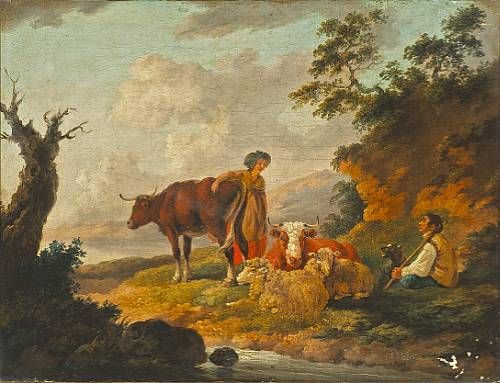 A milkmaid and a shepherd with his flock and cattle in an extensive landscap