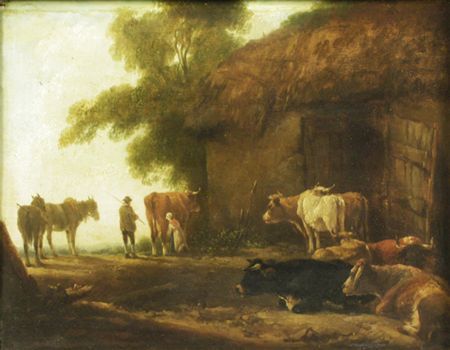 CATTLE BESIDE A BARN WITH A COW BEING MILKED