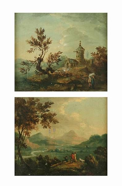 | Lady and gentleman admiring a picturesque landscape, and a lake landscape with ruined church | |