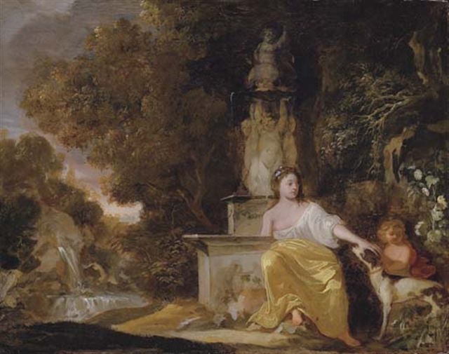 | A lady, seated by a fountain, with a dog and a child, in a landscape | |