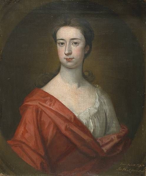 | A portrait of Jane Burdett, half-length, in a white dress and red drape | |