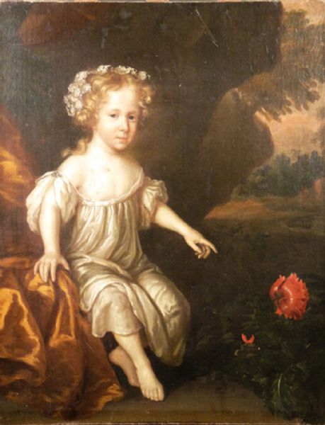PORTRAIT OF A YOUNG GIRL, SEATED FULL LENGTH, IN A LANDSCAPE, POINTING TO A POPPY