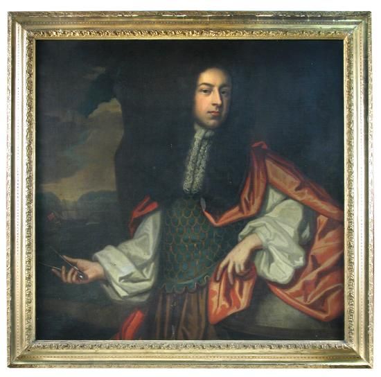 | Portrait, presumably of Sir Frances Dayrell (d.1675) of Shudy Camps, holding a pair of compasses, a globe beside him, ship beyon | |