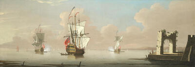 | A capriccio of British men o'war firing salutes with other vessels in calm waters off a harbour | |