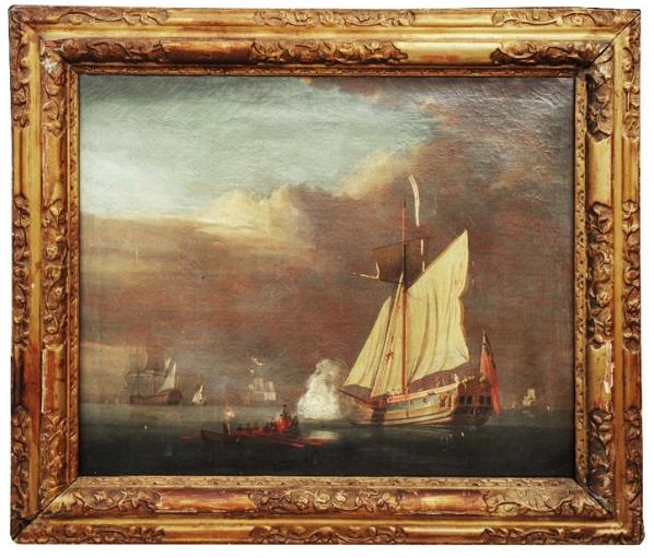 A Royal Navy yacht firing a salute and further shipping in a calm