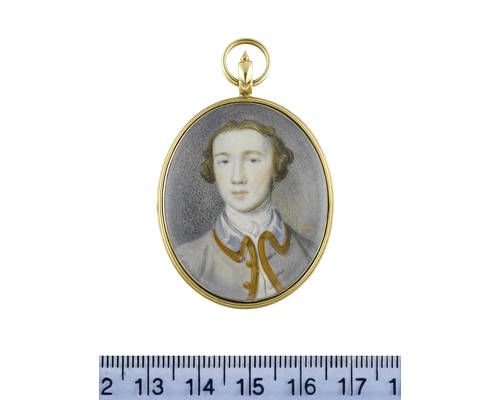 | A Gentleman, wearing pale blue coat with gold trim to edge and collar, white waistcoat, chemise, stock and cravat, natural hair | |