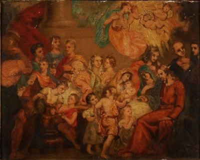 Christ with Biblical figures, attendants and children, an Angelic choir above