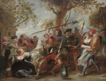 Don Quixote and troops of La Santa Hermandad outside a tavern