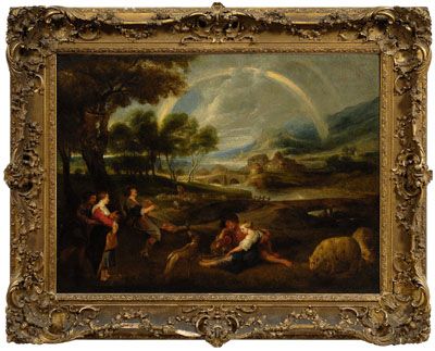 | Pastoral landscape with peasants in a field with sheep, dog, distant double rainbow | |