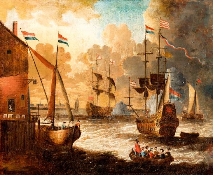 Schepen onder Nederlandse vlag bij voor een havenstad