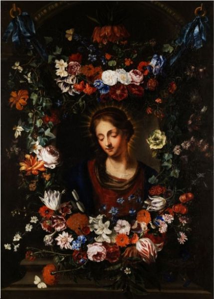 Marienbildnis mit stillebenhafter Blumenrahmung