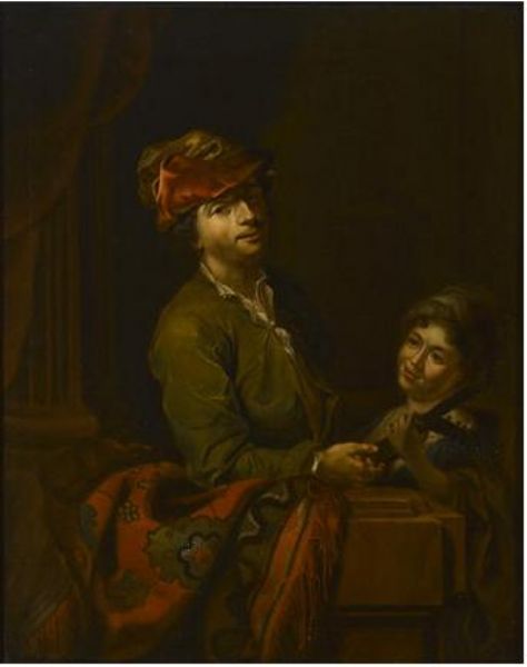 Two figures at a balustrade, one holding a lute