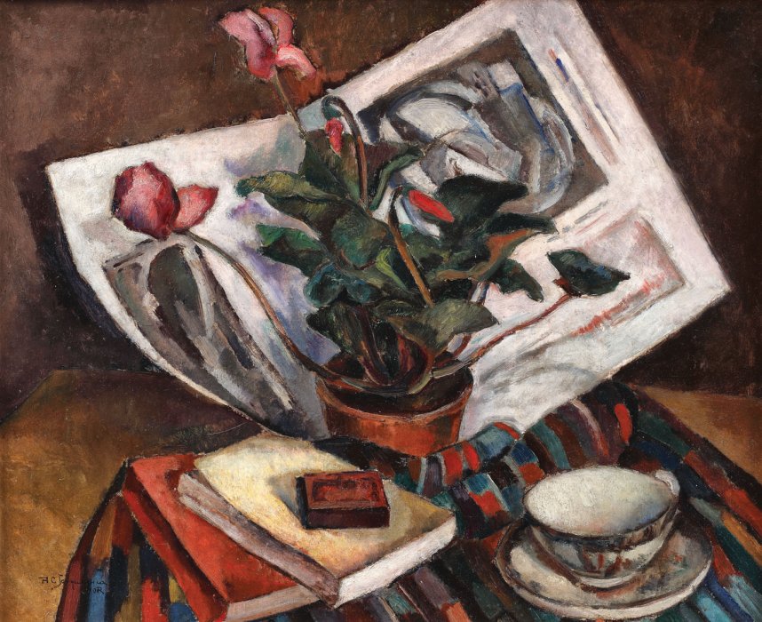 Natură statică cu ceşcuţă şi ghiveci cu cyclamene