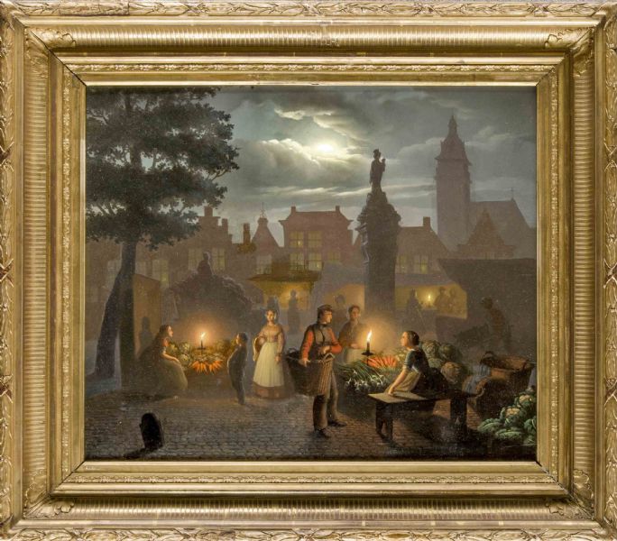 | Belgischer Genremaler, bekannt für seine nächtlichen Szenen, hier ein Nachtmarkt in Antwerpen | |
