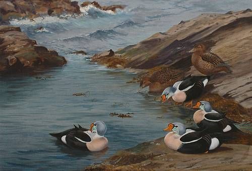 King Eider ducks feeding on the sea shore