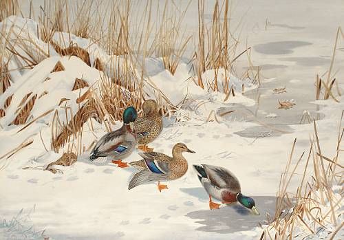 Mallards at the edge of a frozen lake