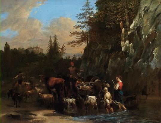 | Drovers and Livestock Crossing a Stream in a Mountainous Landscape | |
