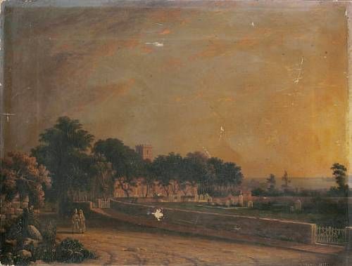 | A Jersey Church, an elegant couple to the fore strolling on a track beside the churchyard | |