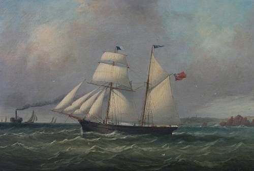 | The Jersey Schooner 'Dispatch' passing St. Helier harbour, a paddle steamer in the distance | |
