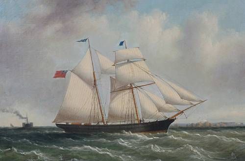 | The Jersey Schooner 'Express' passing the Casquets, a paddle steamer in the distance | |