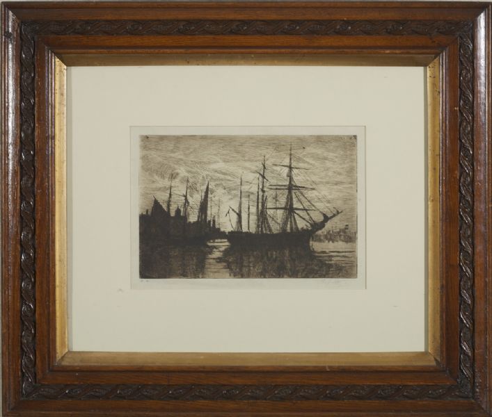 | TWO ETCHINGS OF HARBOR AND COASTAL SCENES IN PERIOD CARVED WOOD FRAMES | |