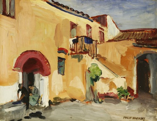 A CONTINENTAL SCENE WITH TWO WOMEN IN A COURTYARD