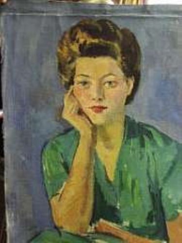 A portrait of a lady, head and shoulders, wearing a blue dress