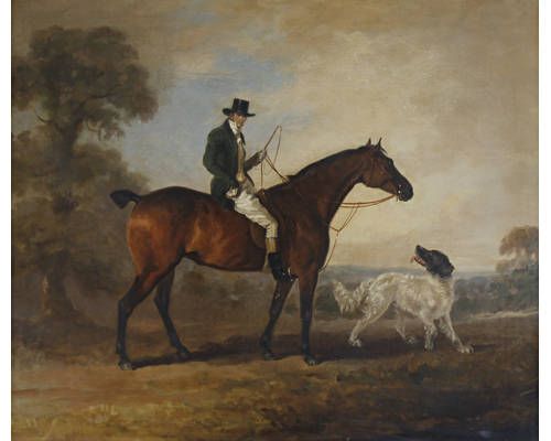 A gentleman seated upon a hunter with spaniel beside