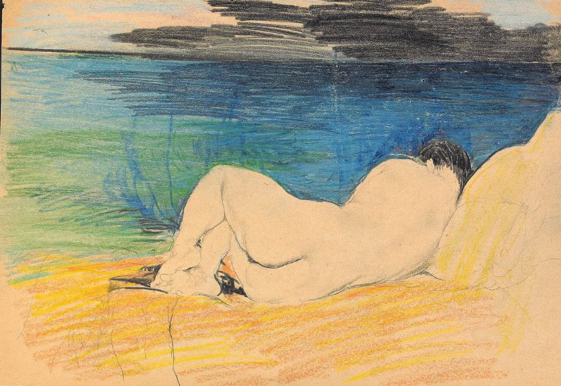 | Reclining female nude, back view, at seashore | |