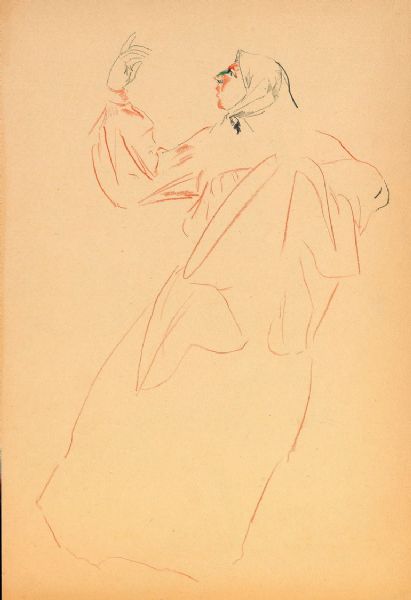 | Woman in kerchief and wide-sleeved gown gesticulating | |