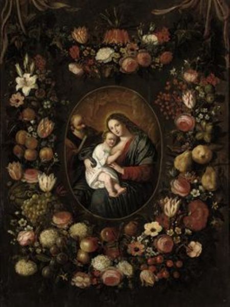 The Holy Family, surrounded by garlands of roses, lilies, tulips and other flowers, apricots, grapes, plums, apples, cherries, p