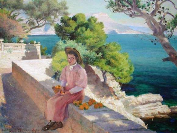 | Ferrat - Jeune fille aux oranges assis su un muret devant la Villa Sicard | |