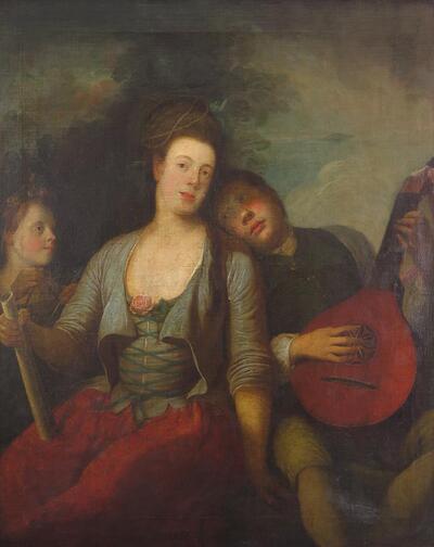 | Portrait of a lady with a boy playing a lute and a girl playing the triangle, possibly an allegory for the sense of sound | |