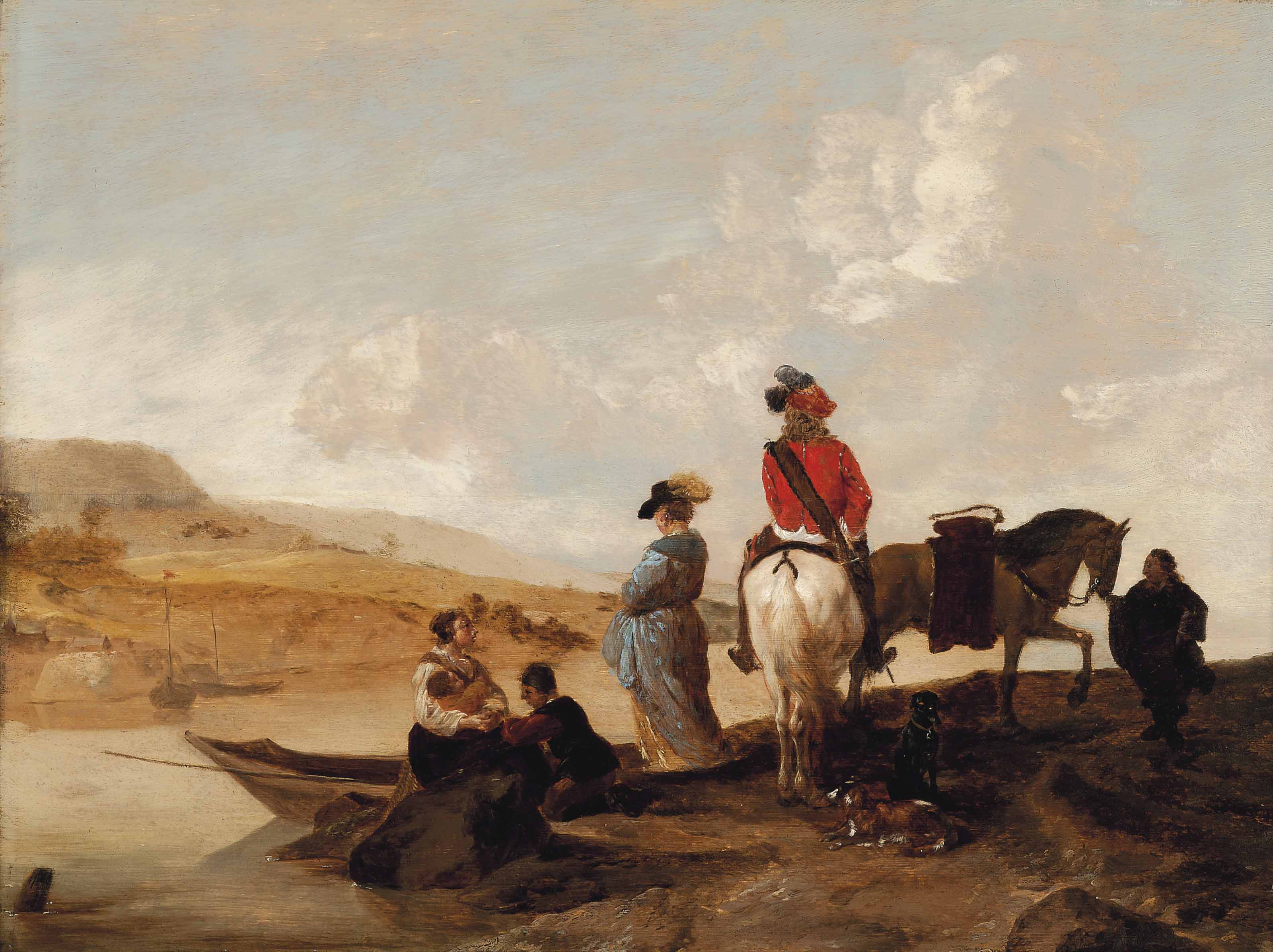 | A horseman and a lady on a bank, with figures by a ferry | |
