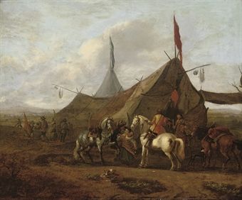 | Horsemen at rest by a sutler's tent, an extensive landscape beyond | |