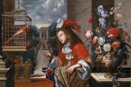 | A boy in courtly attire with a parrot and a vase with flowers against a Baroque park landscape | |